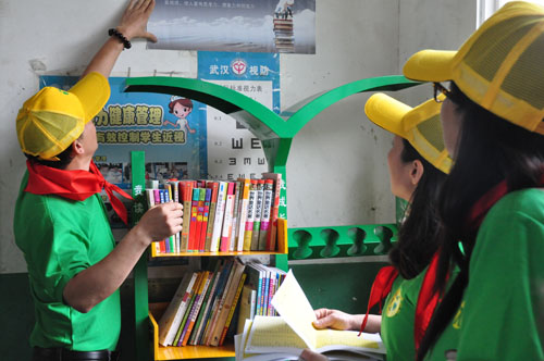 少年智则中国智,少年强则中国强,让贫困乡村学校、城镇打工子弟学校的孩子都能读到好的课外书,让留守儿童也能健康快乐成长。2013年5月30日,为了庆祝第64个六一儿童节的到来,担当者助学服务中心在武汉市蔡甸区消泗乡渔樵中心小学开展了“班班有个图书角”的助学项目。
